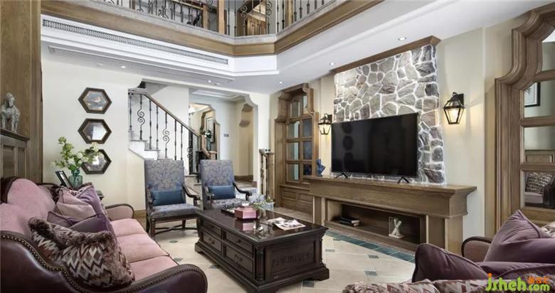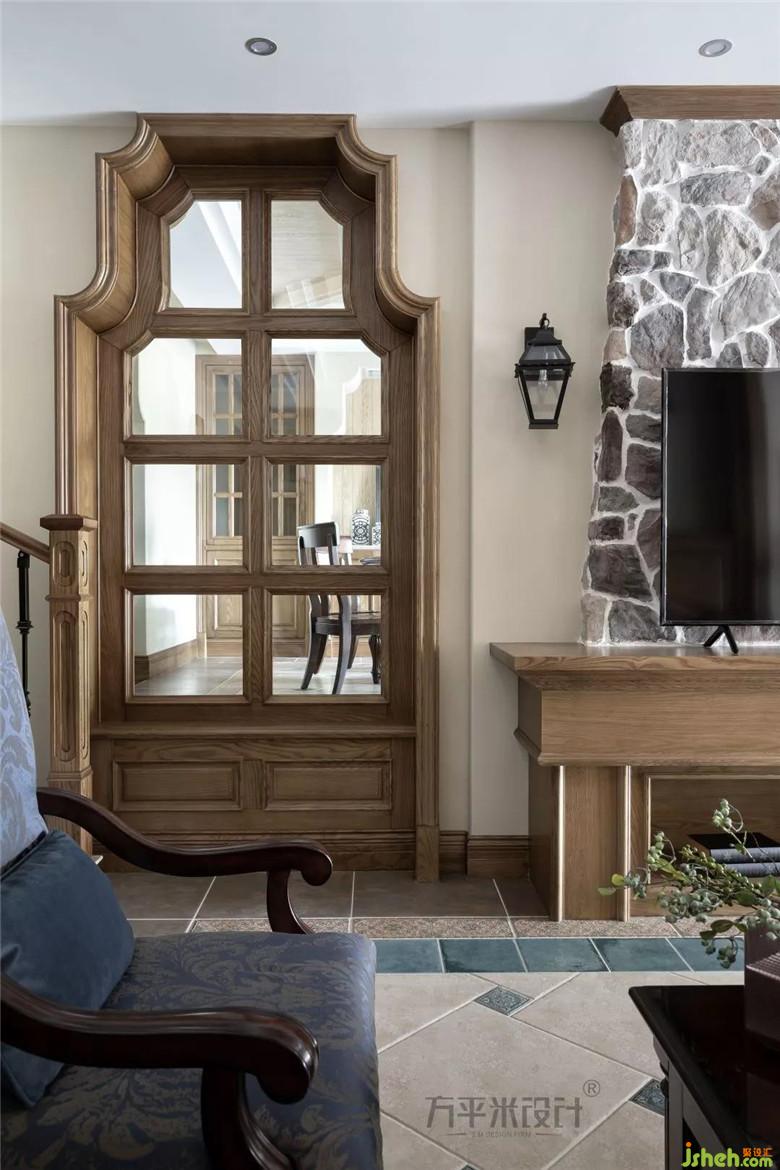 整個空間強調(diào)了對稱形式美學(xué),客廳區(qū)域下沉,地面形成了不同的維度的高差體驗。電視背景墻將客餐廳分隔,為了讓空間得以交流,視覺更加通透,得以延伸,兩側(cè)墻體一面玻璃一面鏡子,一虛一實,平衡輕重。采用富有自然肌理感的文化石進行貼面,搭配黑色戶外鐵藝馬燈,從紋路到質(zhì)感都呈現(xiàn)出莊園式的復(fù)古情懷,詮釋了美式風(fēng)情的特點。