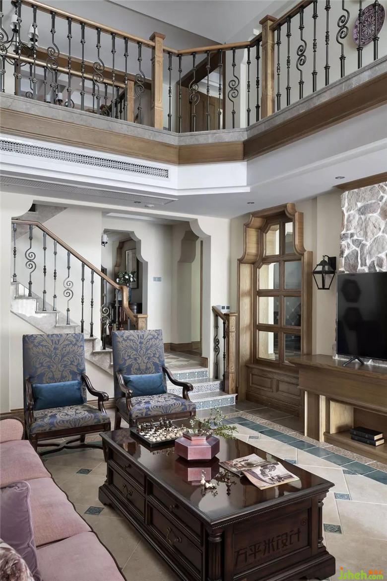 藍色金線提花的單椅靠樓梯方位,后空間狹窄,因而左右兩邊打破對稱,但維持空間體量輕重平衡。色彩從板栗色和淺咖色中跨越出來,更具活躍度和親和力。