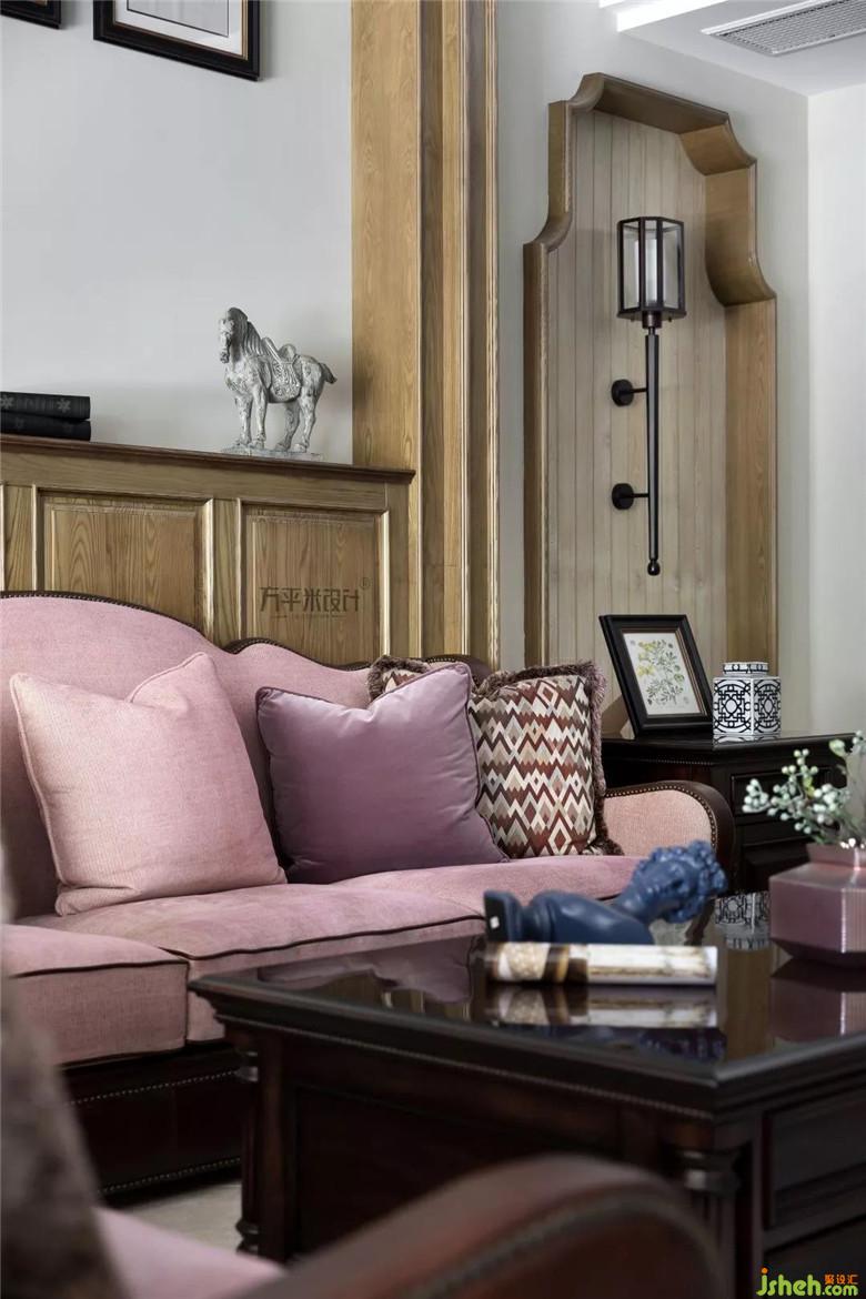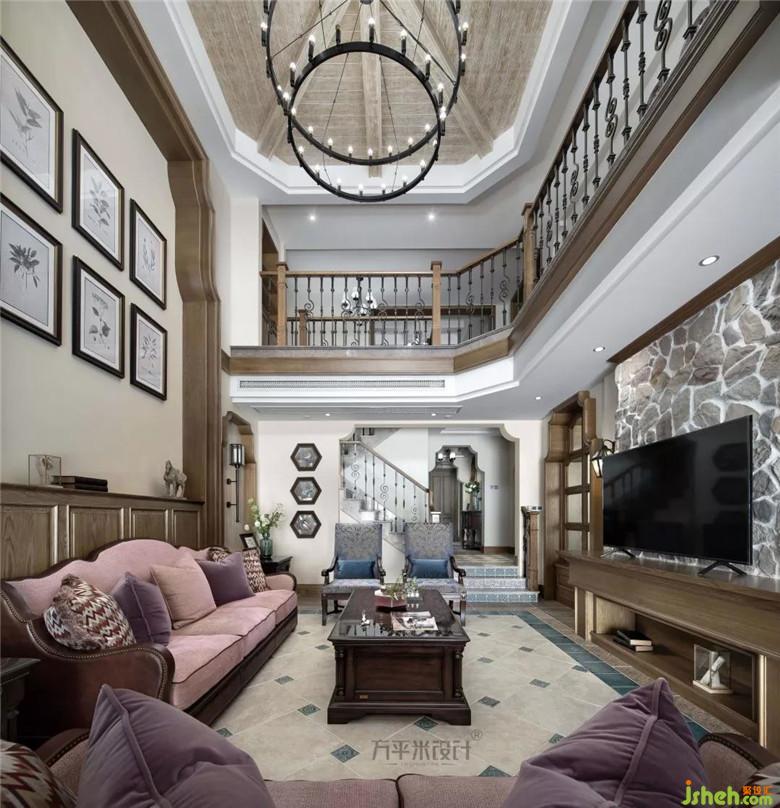 將回廊樓板外側(cè)中間設(shè)置木質(zhì)造型腰線,連接了回廊和主沙發(fā)背景,形成完美收口,宛如腰帶,連接上下。定制的鋁合金噴漆的藝術(shù)風(fēng)口,低奢美觀。過(guò)道墻面懸掛八個(gè)紫色浮花圓盤,別具巴洛克風(fēng)情,和客廳沙發(fā)顏色遙相呼應(yīng)。