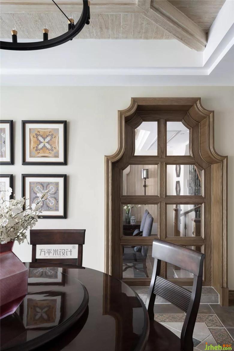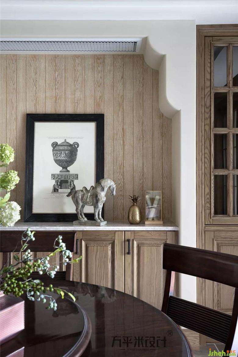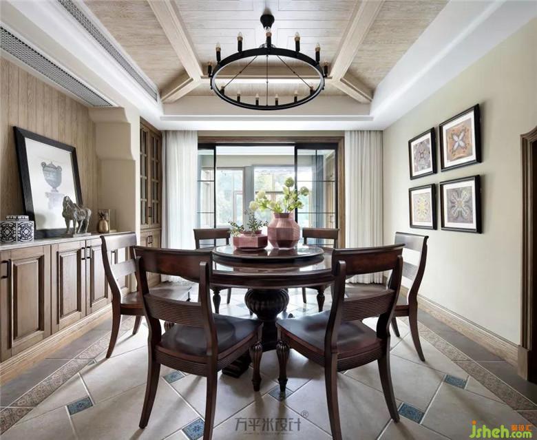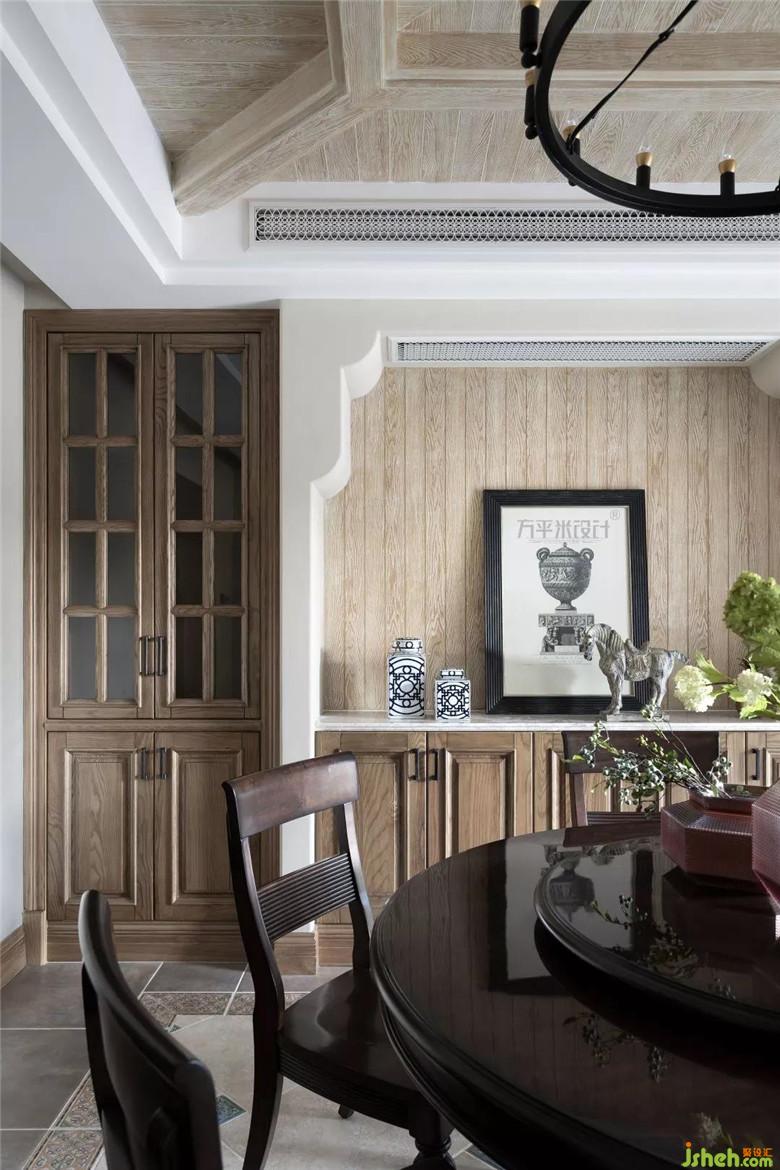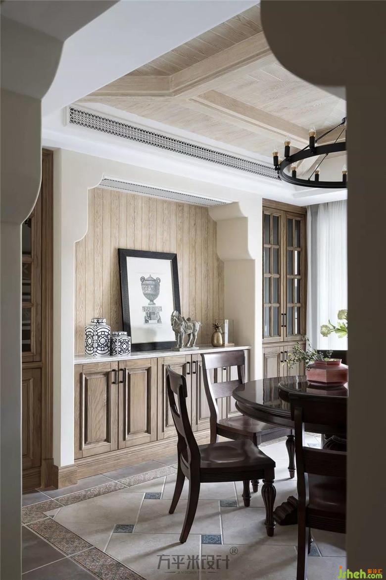 延續(xù)著淺木色調(diào)的復(fù)古美式風(fēng)格,餐廳褪去了傳統(tǒng)美式家具冗雜的造型,與經(jīng)典美式硬裝基調(diào)完美融合。