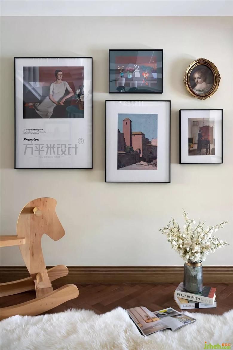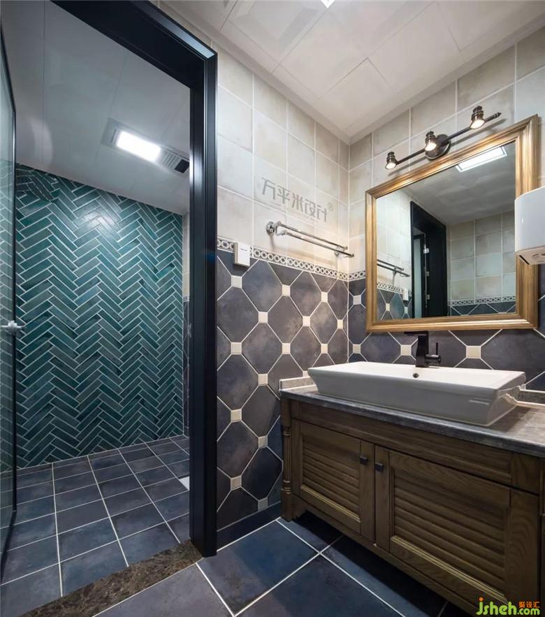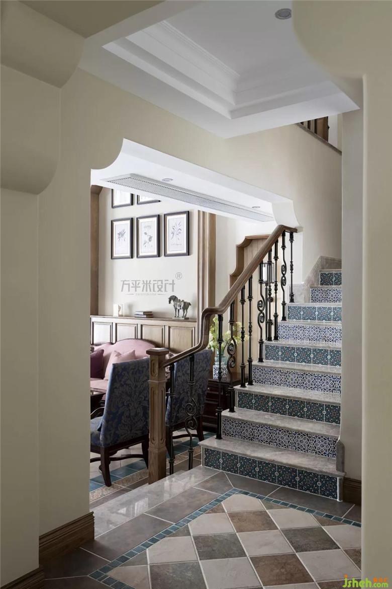 樓梯間綠色波導(dǎo)線和菱形地磚互相襯托,這也是古典美式風(fēng)格的元素代表。一樓除了運(yùn)用布法羅方格花磚的鋪貼之外,樓梯側(cè)板采用了巴洛克花紋地磚,單雙交錯穿插的變化,摒棄了一貫樓梯間的呆板樣式。
