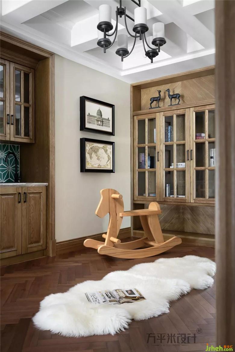 家庭廳成為二層日常居所的交流區(qū),墻面米色乳膠漆與白色吊頂進(jìn)行分色,井字格吊頂完美的和諧了凸出來的主梁。茶水柜的設(shè)置,滿足了二層整體空間的生活需求。旁邊緊挨著小孩房,也為孩子提供了充足的活動空間,方便家人對兩個寶貝的照看。