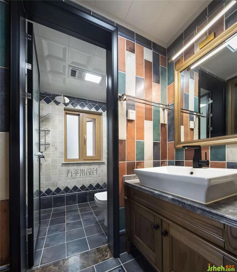 小孩房衛(wèi)生間延續(xù)一層主衛(wèi)手法,地面選用了靛藍色磨砂質(zhì)感仿古石地磚,墻面鋪貼了橘色長形小磚,材質(zhì)統(tǒng)一,整體色彩更顯活潑。