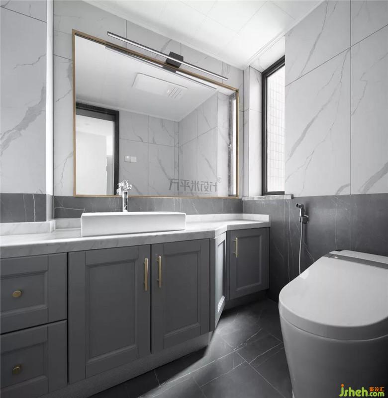 主衛(wèi)延續(xù)了其它功能空間上白下灰的色彩搭配方式,使得空間在視覺上得到延展。