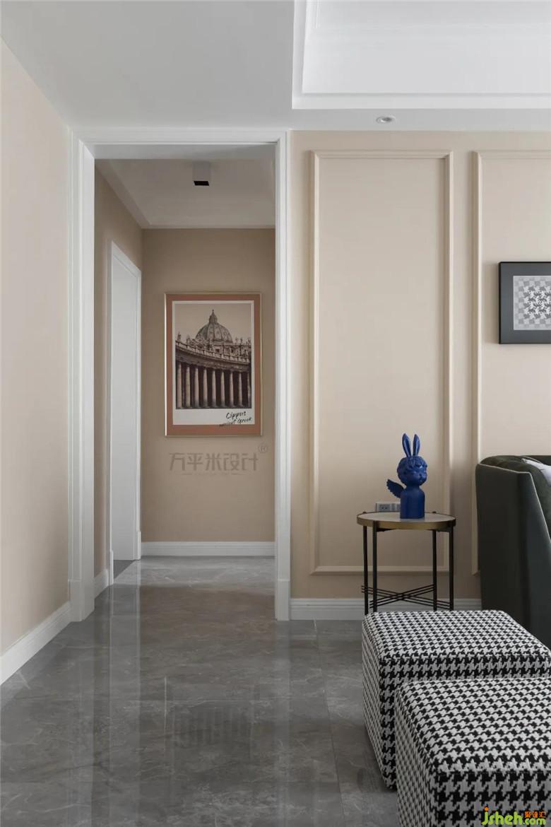 延續(xù)主色調至過道端景,與古城堡裝飾畫相映成趣,從公共領域到私密領域,具有一氣呵成的連貫性。