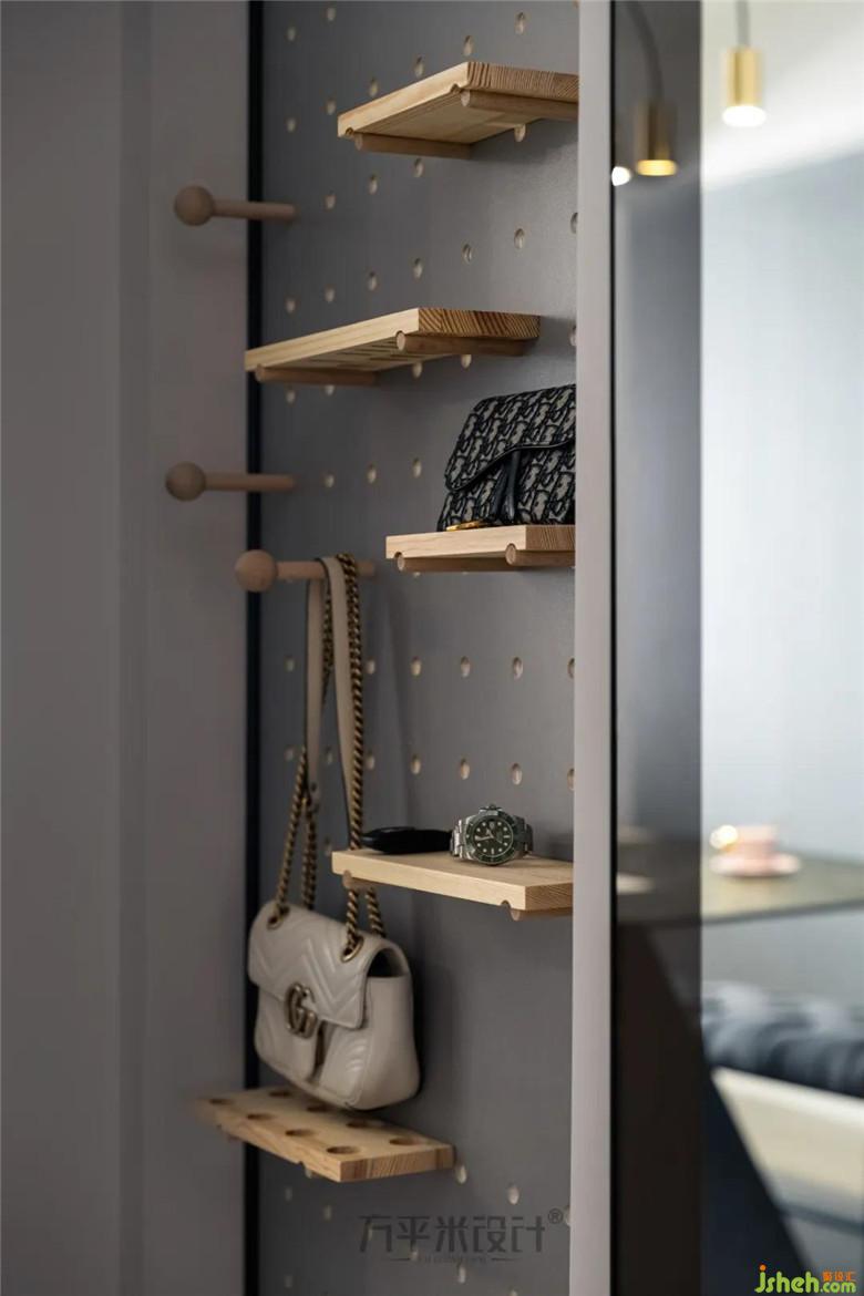 裝修公司將儲物靈活的洞洞板布置在玄關,增強區(qū)域的采光性,達成收納和展示的作用。