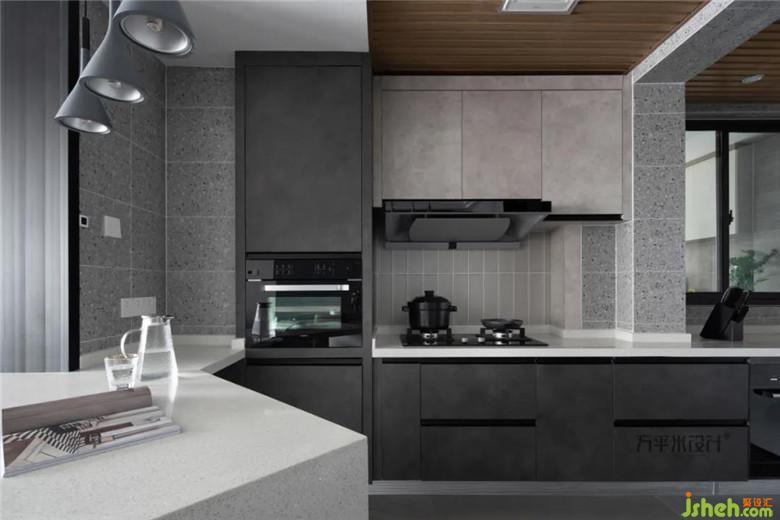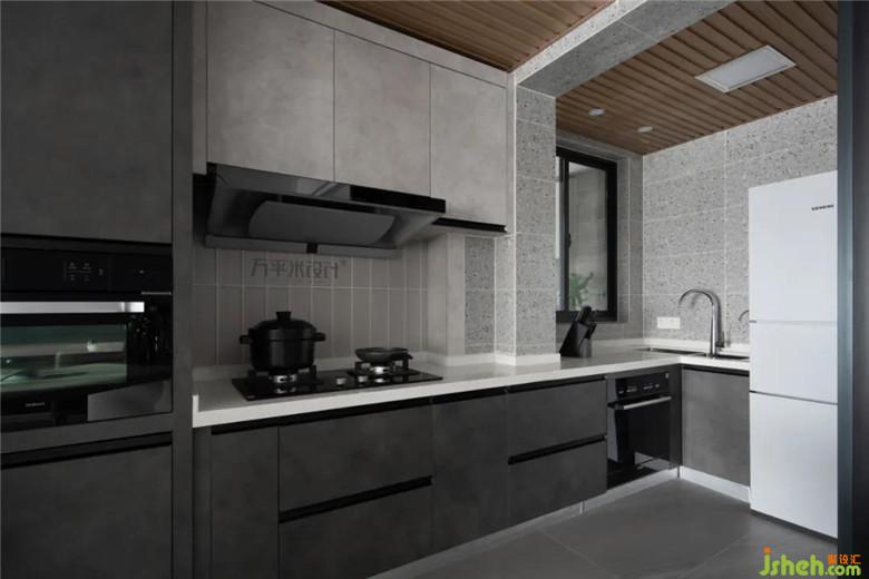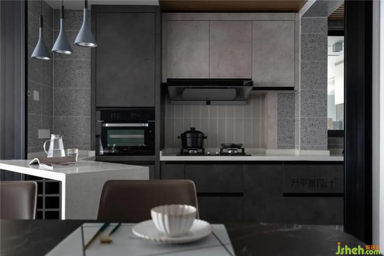 廚房裝修公司調(diào)配不同質(zhì)感的材質(zhì)疊砌立體層次,既有延展過度,又有細(xì)節(jié)疊加。頂部的科技木吊頂比普通扣板整體性更好,在不同元素的碰撞中,創(chuàng)造內(nèi)斂沉穩(wěn)的個(gè)性張力。