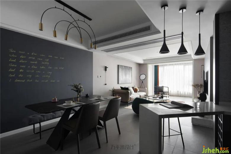 幾何樓梯畫中的透視效果拉伸餐廳縱深感,弧線餐燈的輕盈線條打破空間塊面感,也避免了暗色調(diào)帶來的沉悶。