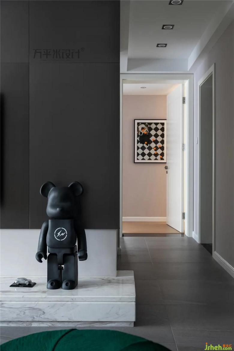 不銹鋼面板延續(xù)至過道一側(cè),使區(qū)域間過渡緩和。地臺(tái)上的Bearbrick積木熊擺件瞬間增添不少的藝術(shù)氣息。