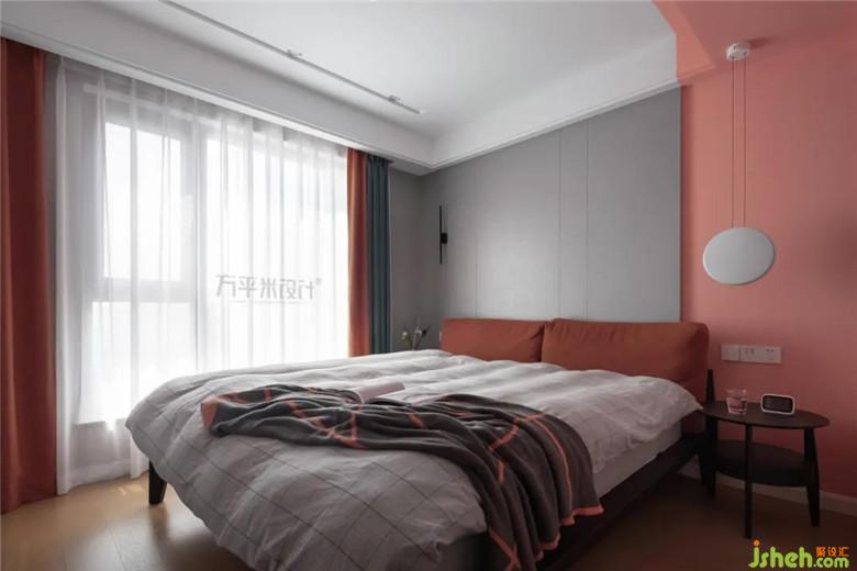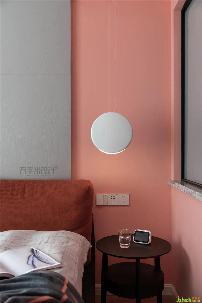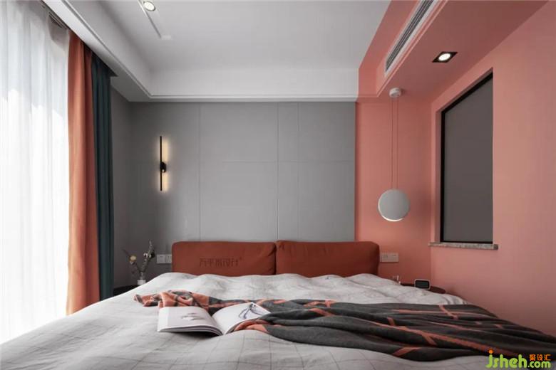 “適當(dāng)?shù)拇竽懭ビ蒙炊鴷?huì)有意想不到的效果出現(xiàn)。”當(dāng)內(nèi)斂的灰色與張揚(yáng)的珊瑚粉拼接時(shí),即是沉穩(wěn)感與浪漫感的混合,同色系的窗簾和深肉桂色的床頭軟包,實(shí)現(xiàn)了色彩上的過渡和連接,共同構(gòu)筑和諧而有層次感的空間面貌。