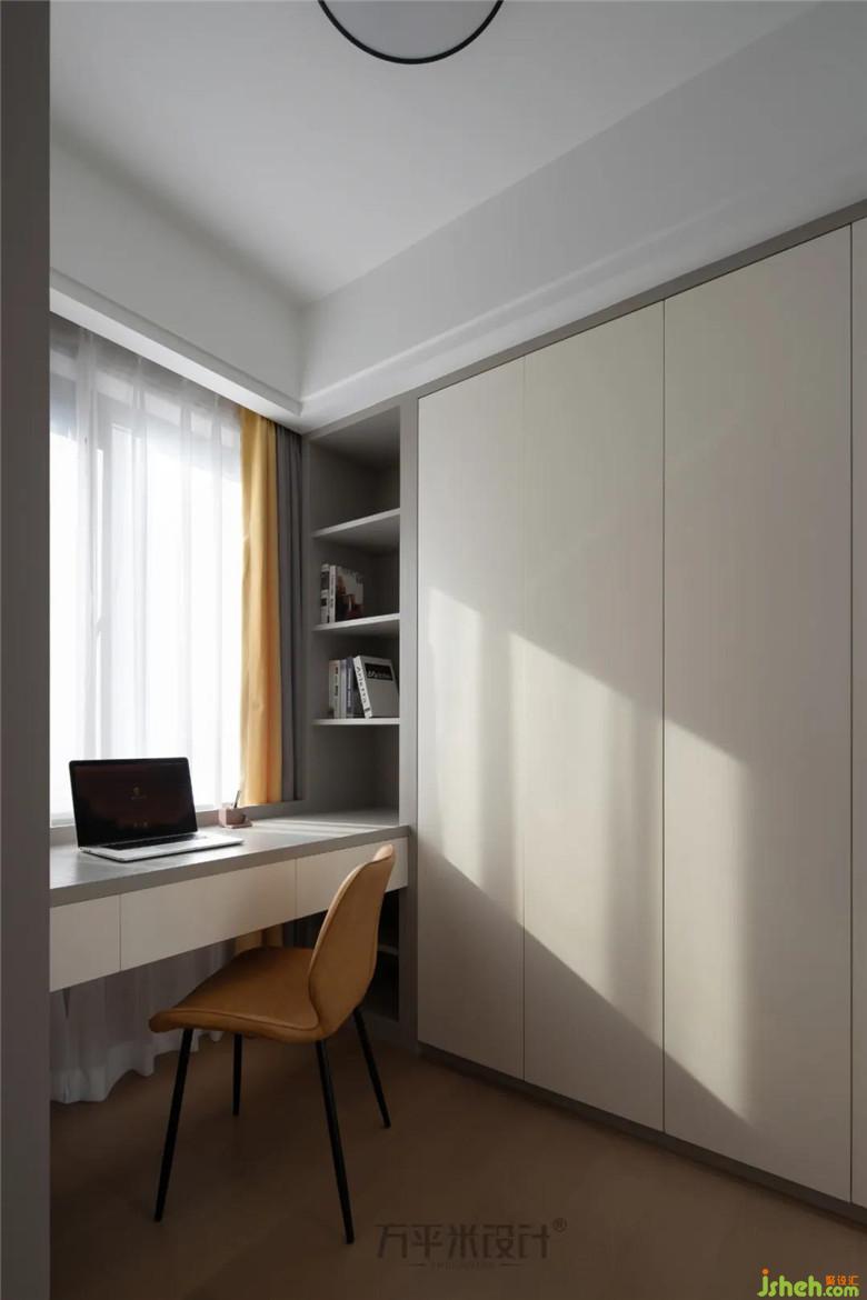 書(shū)房兼做衣帽間,反彈式柜門使整體立面簡(jiǎn)潔美觀,通過(guò)材質(zhì)與書(shū)桌延伸在一起,形成規(guī)整大方的視覺(jué)效果。