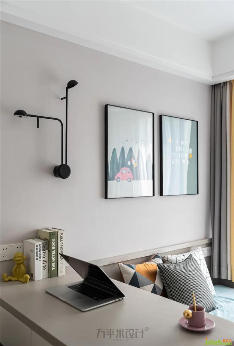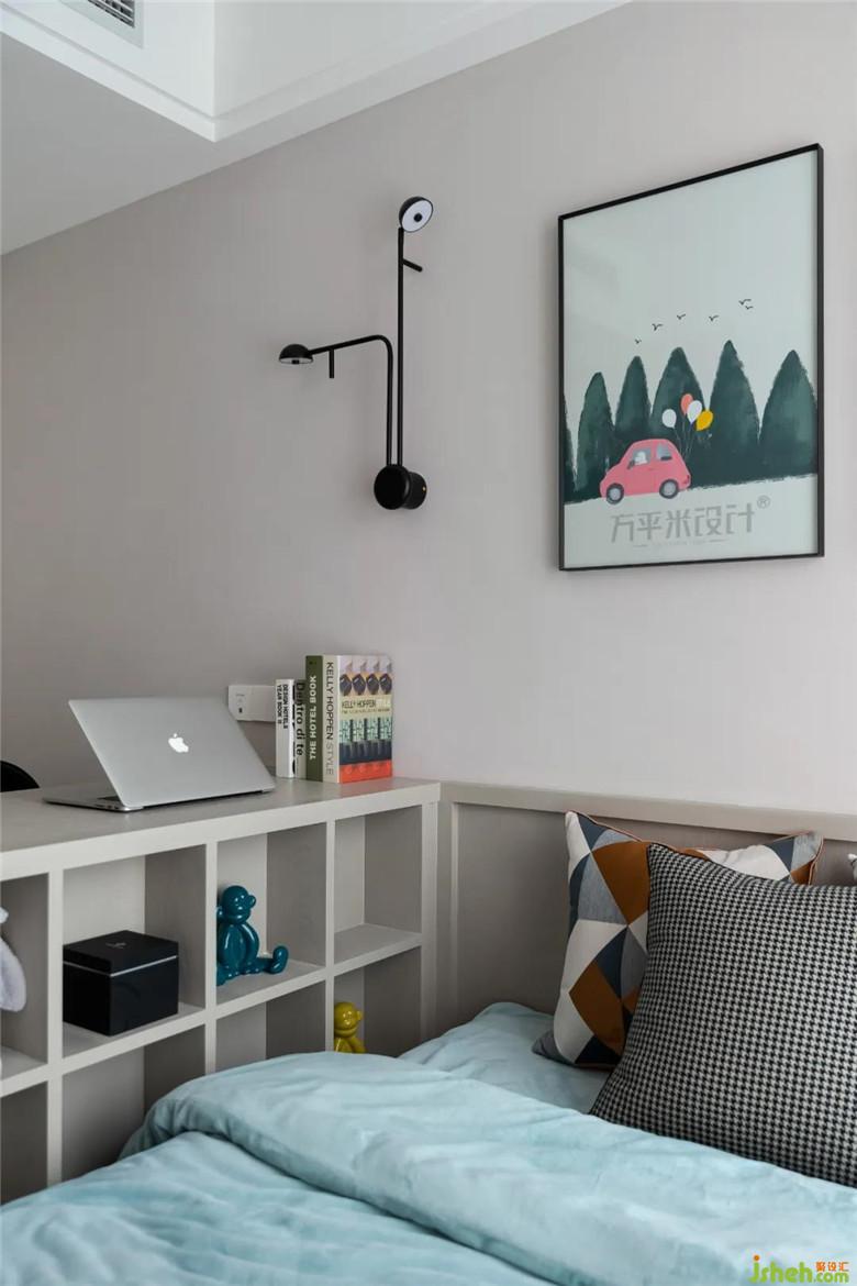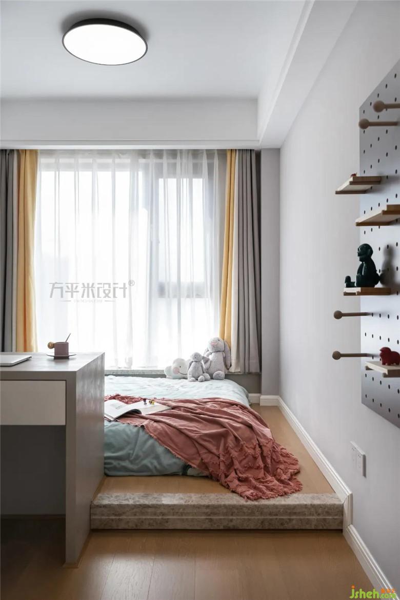除了玩耍區(qū)外,學(xué)習(xí)區(qū)也必不可少,將書(shū)桌圍合地臺(tái)床設(shè)計(jì),內(nèi)側(cè)有隔斷可收納物品,使有限的空間承載豐富的生活場(chǎng)景。