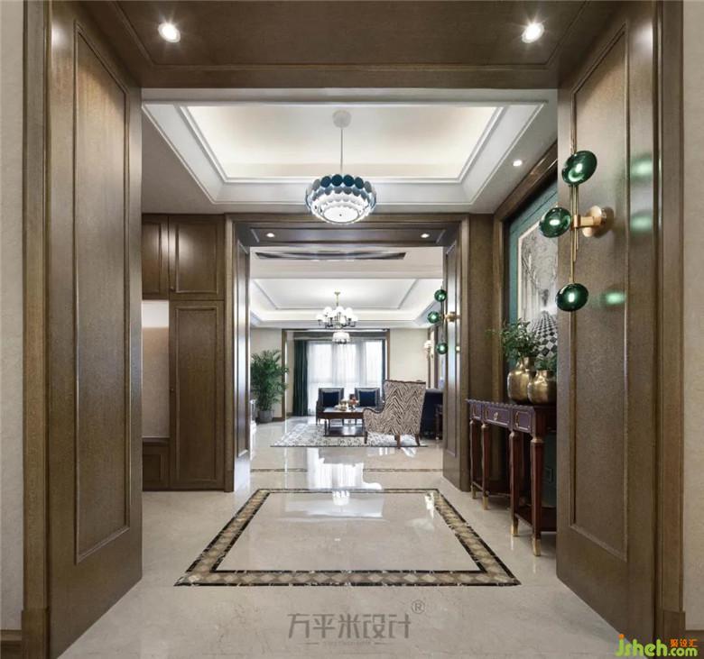 裝修公司在既有大理石地坪及木飾面的硬裝基礎(chǔ)上,運(yùn)用墨綠色于墻面及兩側(cè)壁燈中,打破原有米色基調(diào)的沉穩(wěn)感,使整體空間氛圍更顯生動(dòng)。