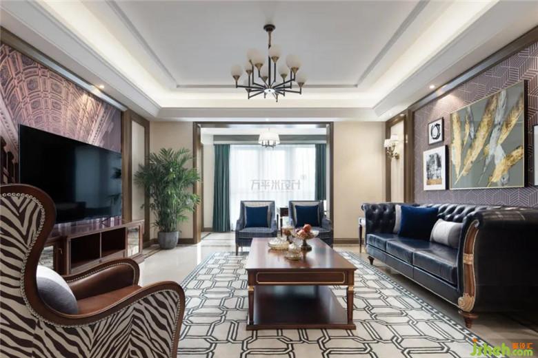 整體家具與地磚呈現(xiàn)一深一淺的對(duì)比,裝修公司運(yùn)用灰白幾何連續(xù)圖案地毯起到過(guò)渡效果。