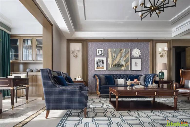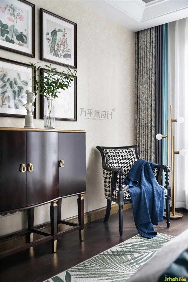 仔細看會發(fā)現(xiàn),茶幾側面板,沙發(fā)扶手,木飾面邊條,裝飾畫框及吊燈都有金色元素,用意在于提升細節(jié)處的精致度,營造輕奢質(zhì)感。
