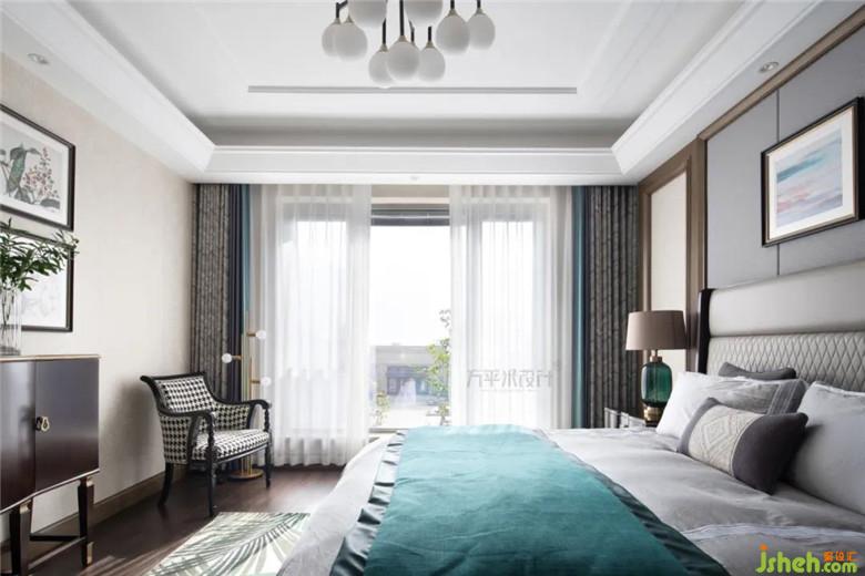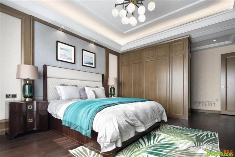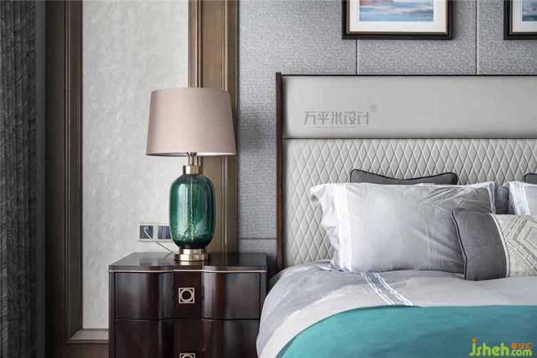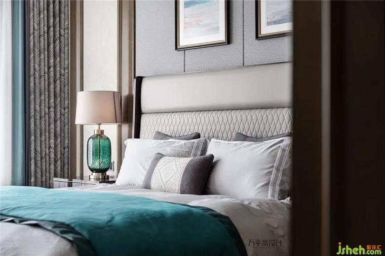 灰色紋理硬包與木質(zhì)肌理邊框相互襯托,搭配色調(diào)柔和的抽象裝飾畫,織構出一室溫潤。