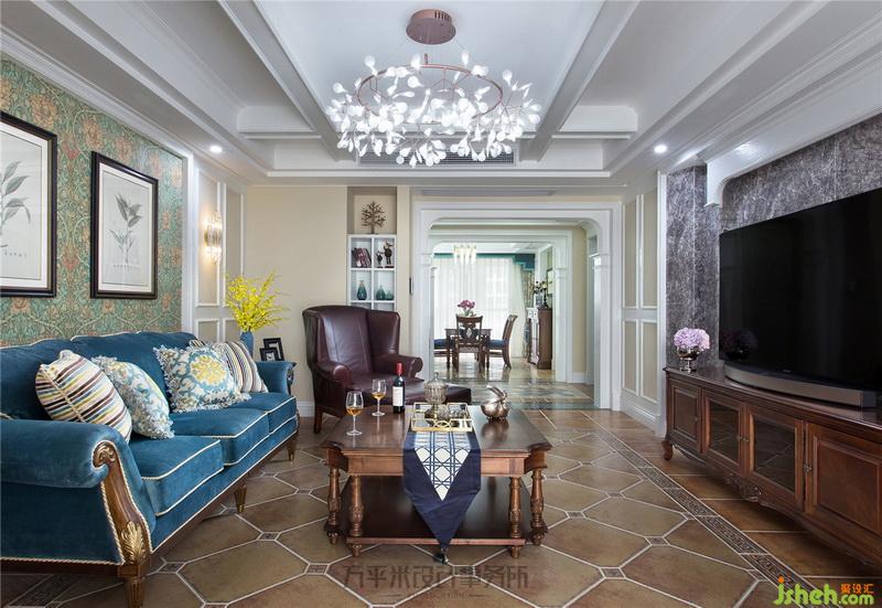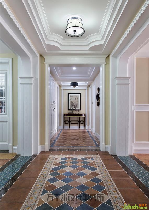 ▼ 推門入戶、映入眼簾的即是門廳與中廳的連續(xù)空間,室內(nèi)設(shè)計師以浪漫的多重頂面曲線弧度、雙側(cè)門洞對稱美式造型立柱圍合空間于無形;中廳處門洞與端景處相同的美式門頭造型前后一致、有連貫嚴(yán)謹(jǐn)?shù)臐u進(jìn)放大層次,使端景優(yōu)雅展現(xiàn);地毯式拼花地磚呼應(yīng)于全屋用色,將湖藍(lán)色光潔手工磚嵌入大理石門檻,加寬的線型亦應(yīng)對了中廳同色系窄條波導(dǎo),隨步伐折射湖水波光般光影,為空間帶來色彩躍動。