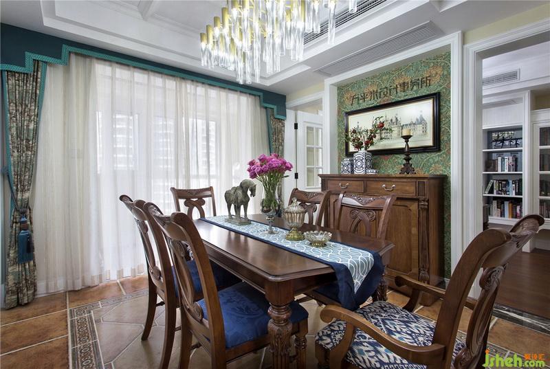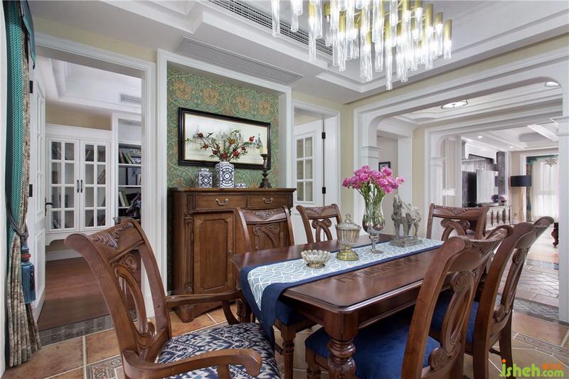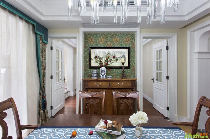 ▼ 室內(nèi)設(shè)計師將原有書房入口從走廊處改至餐廳一側(cè),以通透清玻雙門取代單門,使相連的兩個房間視線延伸,達(dá)到放大空間的效果。雙側(cè)門套與中心門洞形成高低與進(jìn)退的錯落層次。采用客廳同款墨綠藤蔓花紋進(jìn)口墻紙飾面,以呼應(yīng)兩個主要起居空間。造型古典的原木餐邊柜恰好嵌入門洞,懸掛精心選配的條形城堡建筑裝飾畫作,以考究的比例分隔組成豐富可看的功能立面。如詩如瀑的燈光傾瀉,照亮這一優(yōu)美的就餐環(huán)境。