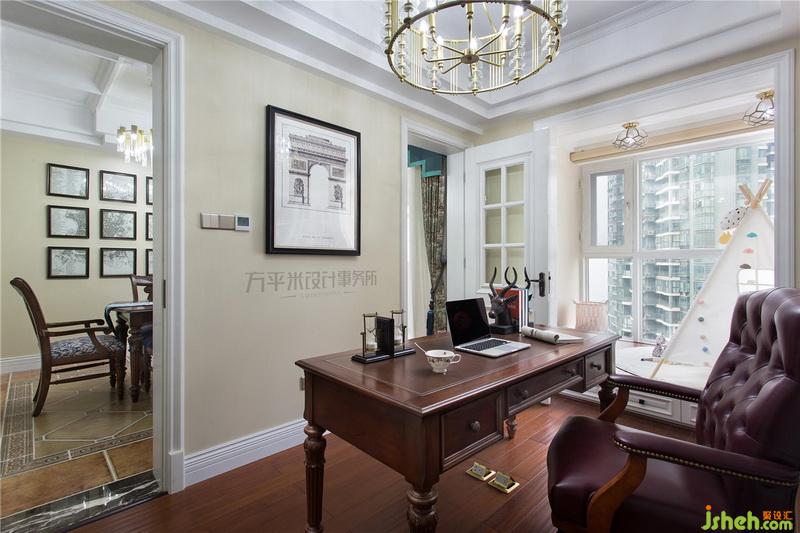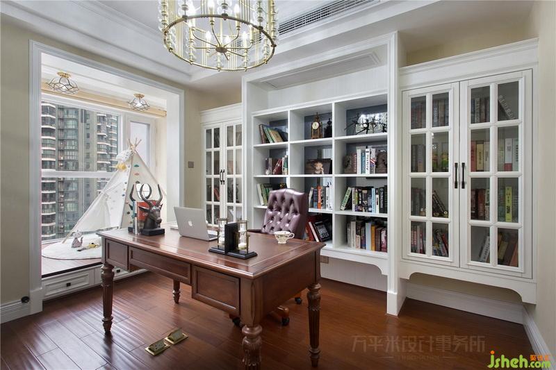▼ 滿墻書柜上下留空,中央開放式柜體以灰鏡打底,呼應(yīng)于兩側(cè)清玻柜門,在保證功能的前提下也保留了空間通透感。將光線良好的部分生活陽臺并入室內(nèi)空間,設(shè)計為儲物式榻榻米地臺。放上一頂可愛的帳篷,鋪上柔軟小毯,作為業(yè)主年幼女兒的小小休閑區(qū),使得書房亦成為親子交流的無拘空間。
