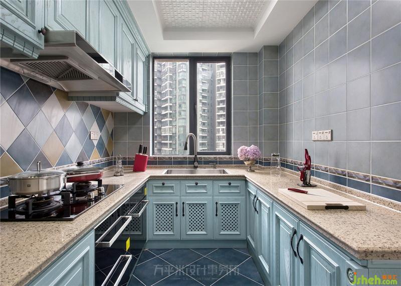 ▼ 以淺灰及靛藍(lán)仿古磚鋪貼的廚房,搭配少見的做舊淺藍(lán)色原木櫥柜,延續(xù)全屋統(tǒng)一色調(diào)與清爽浪漫氣質(zhì)。淺米色U型操作臺面操作便利、利用率高。頂面采用石膏板圍合波浪形高分子板的處理方式,兼具收口美觀、便于后期維護(hù)的雙重優(yōu)點(diǎn)。