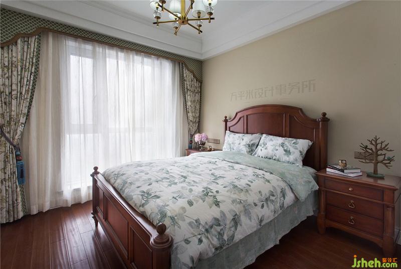 ▼ 作為偶爾使用的老人房兼客臥,設(shè)置在起居便利的南向臥室,放置仿古美式大床。屋內(nèi)以奶咖色墻漆涂刷全房,搭配灰綠色系花鳥主題窗簾與床品,雖簡單亦清爽溫馨。