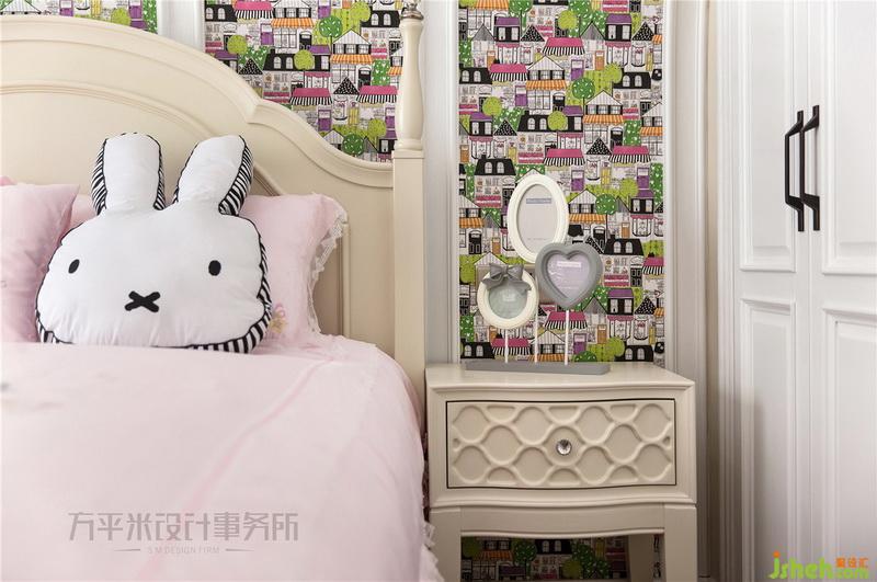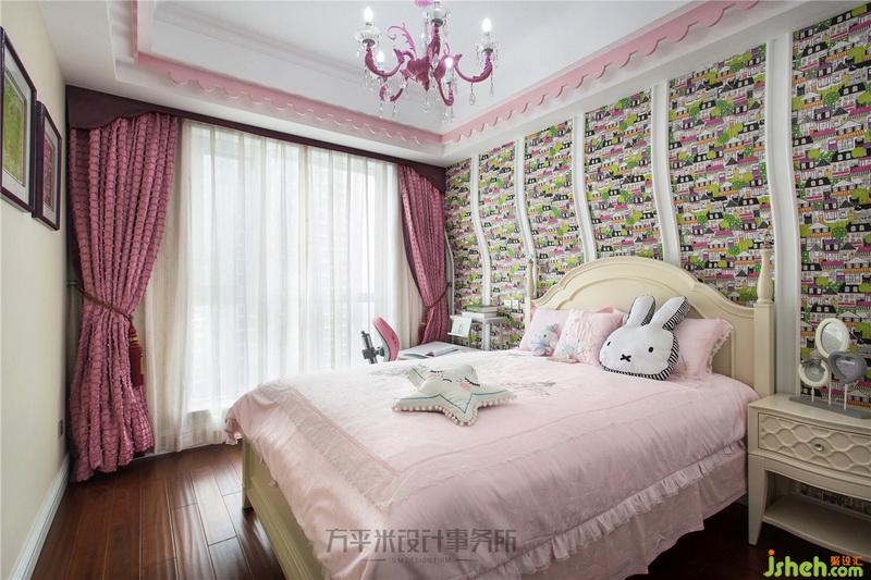 ▼ 波浪形頂線、水晶吊燈、窗簾、裝飾畫、升降桌椅、床品全部選用可愛的粉色系,協(xié)調(diào)統(tǒng)一。并以弧形墻面和卡通墻紙打造出與眾不同的童趣公主房。