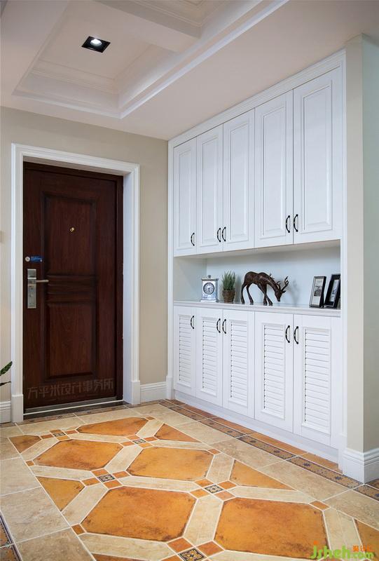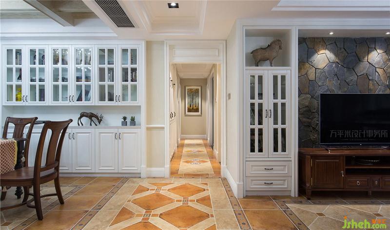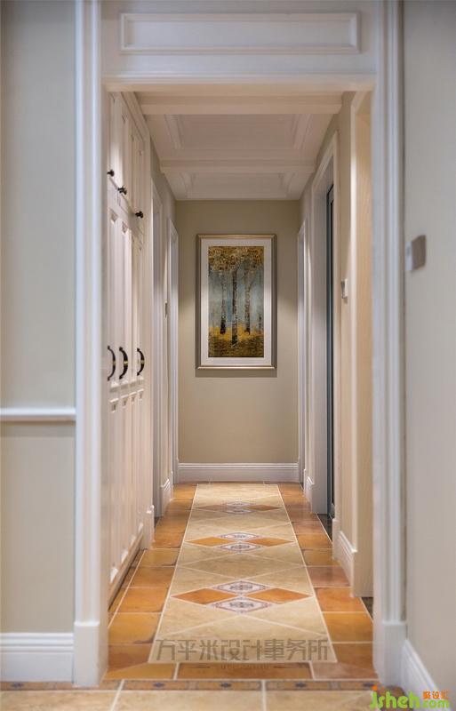 ▼ 推門入戶即是長(zhǎng)距離的連續(xù)門廳及走廊,以色彩呼應(yīng)的花型地磚豐富視線。巧妙隱藏原有真梁的頂面處理,以最大程度保留原有凈空的方式,將空間感持續(xù)延伸,不顯壓抑。多個(gè)獨(dú)立斗膽燈作為點(diǎn)光源、溫柔點(diǎn)亮步伐所至,也將走廊端景的畫作優(yōu)雅呈現(xiàn),以金秋的收獲寓意美好生活的沉淀與積累。室內(nèi)設(shè)計(jì)師