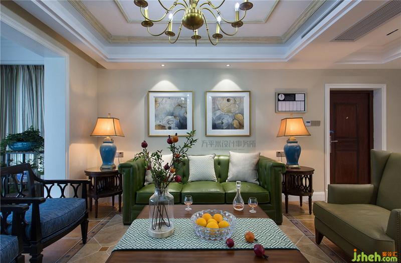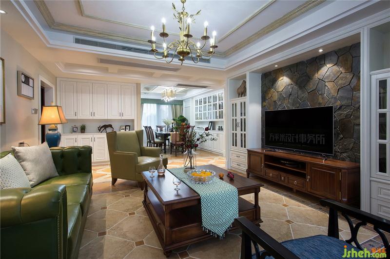 ▼ 風(fēng)化白的雙層木質(zhì)頂線與銅制燭形頂燈的淺金色質(zhì)感精致裝點(diǎn)頂面。以銹色粗礪文化石為底,雙側(cè)木質(zhì)展示柜體圍合,將古典的深棕原木電視柜體絲絲入扣安靜襯托,形成層次分明立體,質(zhì)感對(duì)比強(qiáng)烈的豐富立面。藍(lán)色布面單椅搭配暗綠色皮質(zhì)沙發(fā)主位,呼應(yīng)于淺藍(lán)抽象裝飾畫作與雙側(cè)青瓷對(duì)燈,令色彩在整個(gè)空間輕柔暈染、優(yōu)雅靈動(dòng)。