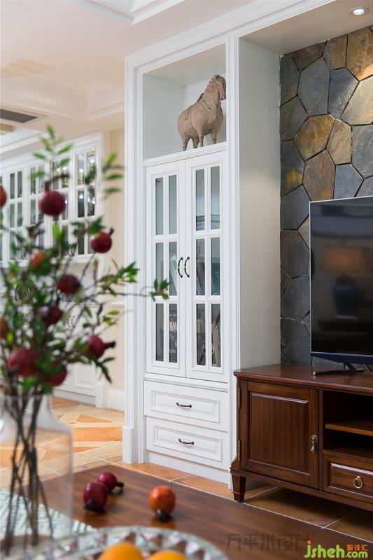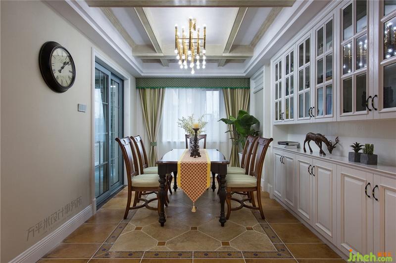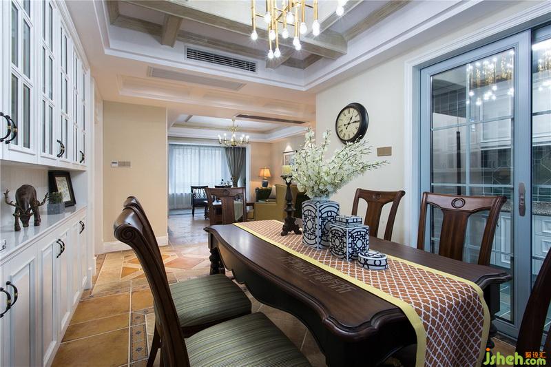 ▼ 將原有墻體拆除,設(shè)計(jì)了大面積嵌入式儲(chǔ)物邊柜,以清玻柜門展示男主人珍藏美酒,柜體左側(cè)制作與走廊一致的美式門頭,巧妙借用走廊景深的同時(shí)也使得立面規(guī)整對(duì)稱。風(fēng)化白的交錯(cuò)造型木梁間,璀璨燈珠閃耀,照亮典雅就餐環(huán)境。
