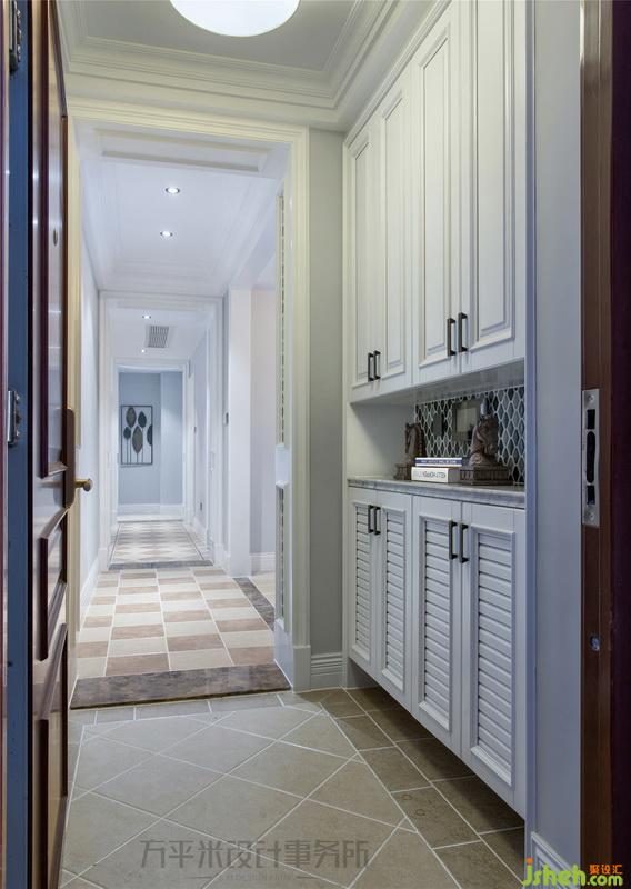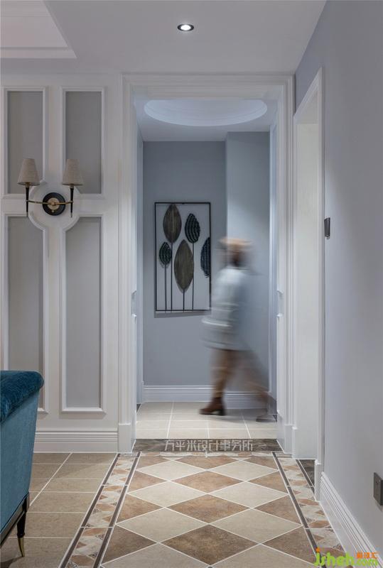▼ 玄關(guān)以相同地磚的不同鋪貼方式來(lái)打破入戶后長(zhǎng)距離的無(wú)趣,深淺咖色交錯(cuò)間溫暖烘托出灰藍(lán)墻面的光潔寧?kù)o,刻意擴(kuò)大的三個(gè)連續(xù)門套造型一致互為呼應(yīng),漸進(jìn)放大的層次感令走廊盡頭的端景優(yōu)雅呈現(xiàn)。