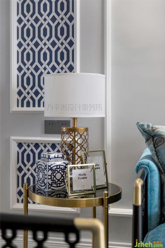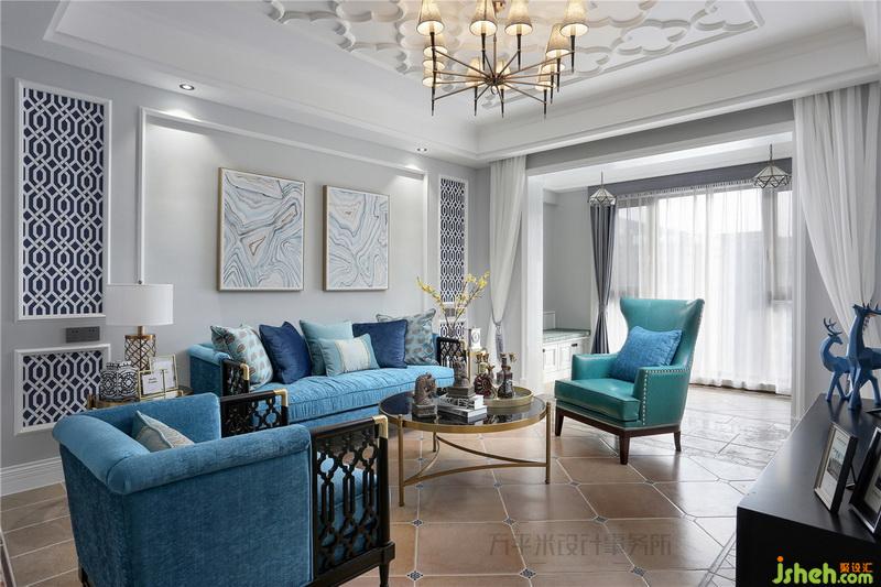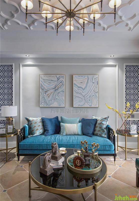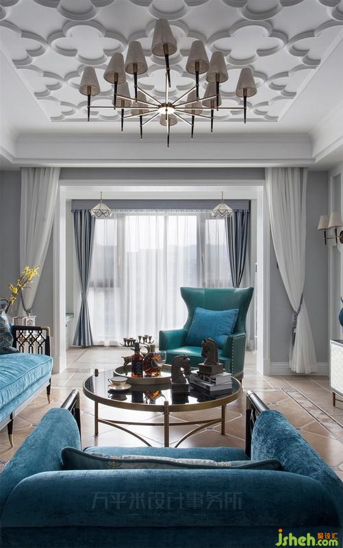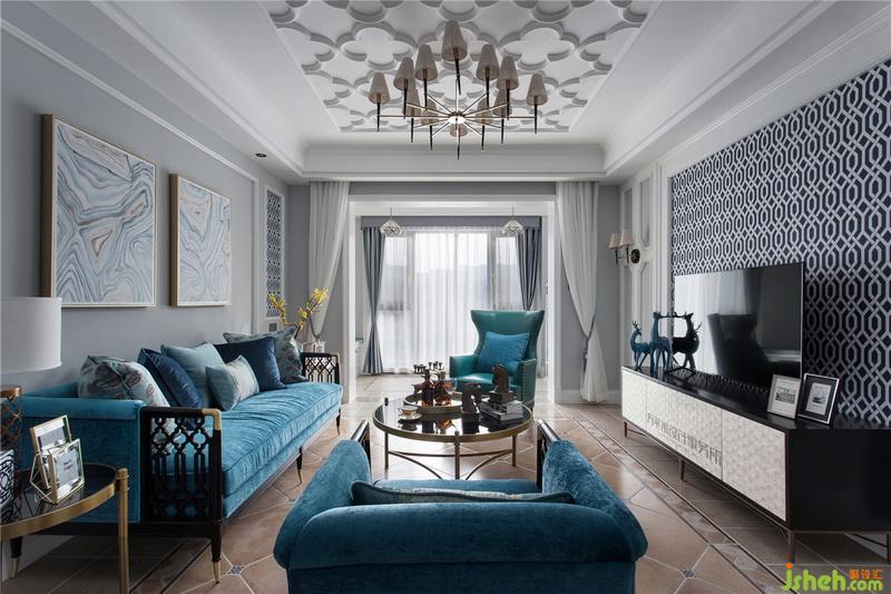 ▼ 客廳為充滿欣喜活力的起居空間,明媚陽(yáng)光透過(guò)輕柔紗簾,溫柔進(jìn)入客廳中心會(huì)話區(qū)域。景觀陽(yáng)臺(tái)貼心設(shè)計(jì)卡座,使其成為休閑品茗區(qū)域。以開(kāi)放式門洞分隔,作為客廳空間的延伸,使得波光粼粼的開(kāi)闊湖景,通過(guò)落地景觀窗一覽無(wú)余的進(jìn)入客廳視野。色彩瑰麗的墻紙、窗簾、沙發(fā)、裝飾畫(huà)作等主次分明、色調(diào)互為呼應(yīng),如陽(yáng)光下海水色澤般美麗變幻,過(guò)渡輕柔。精致黃銅家具及燈具造型優(yōu)雅、線條簡(jiǎn)潔,凸顯質(zhì)感及品味。
