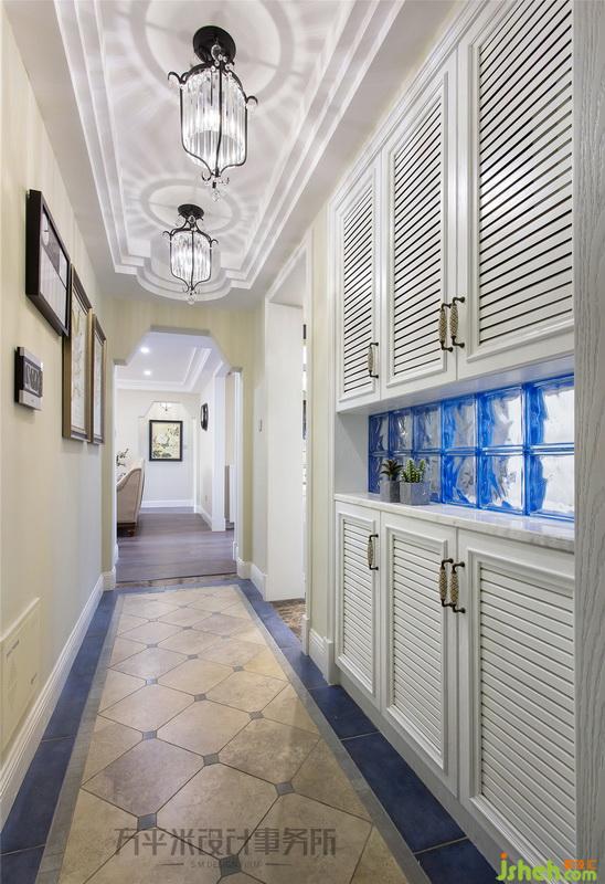 ▼ 推門入戶,因精致水晶燈飾的流光折射、及右側(cè)冰藍采光磚處引入的自然光線,令空間光影通透。頂部以優(yōu)美線型逐級重復強調(diào),應對連續(xù)門洞的梯形典雅造型,使不同立面均有呼應遞進層次。