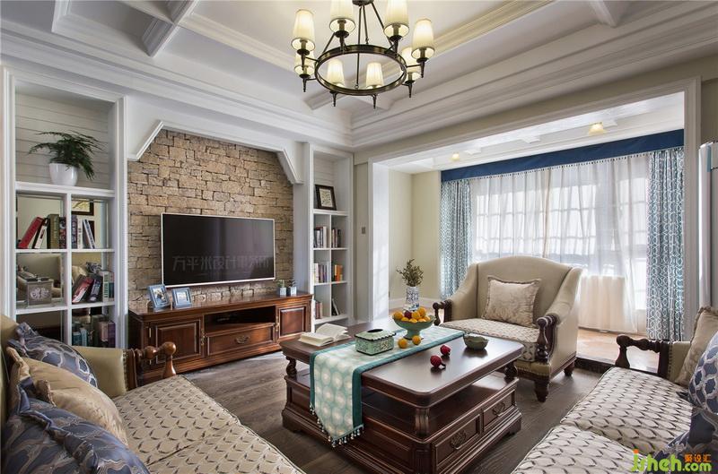 ▼ 將景觀陽臺作為客廳延伸,令視野開闊,空間通透。明媚陽光溫柔灑滿屋內(nèi),帶來從容暖意??桃馓Ц叩年柵_區(qū)域向外側(cè)擴充些許,令客廳地面區(qū)域于無形間放大,更為寬松的容納厚重美式沙發(fā)組合。
