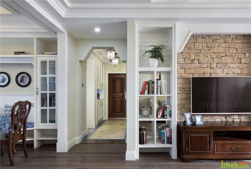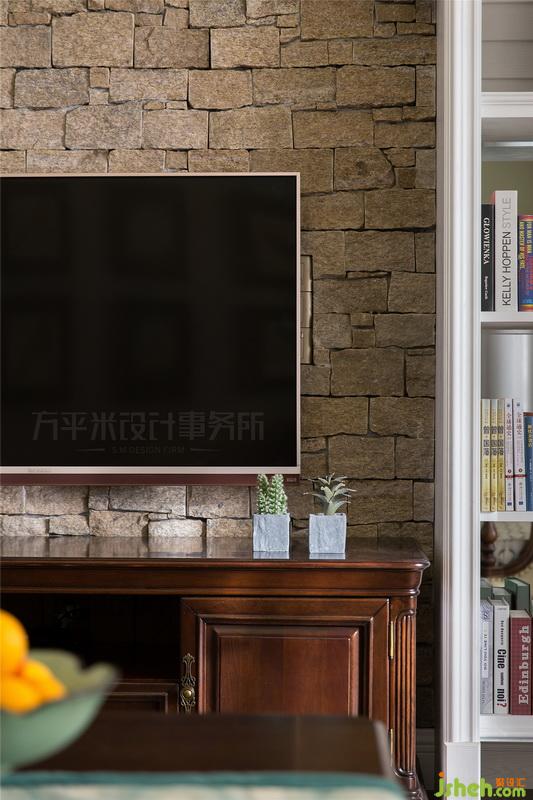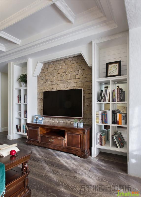▼ 電視墻以純白木質(zhì)開放式展示柜圍合咖色自然石材底面,利用材質(zhì)的粗礪與細膩對比來烘托原木家具的考究線條。展示柜內(nèi)使用鏡面打底,使空間視覺有所延伸,梯形頂線造型呼應于走廊處的連續(xù)門洞。