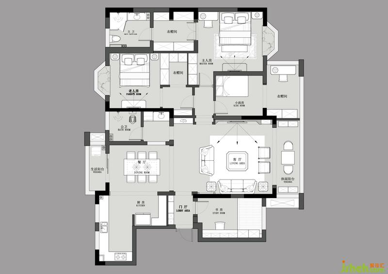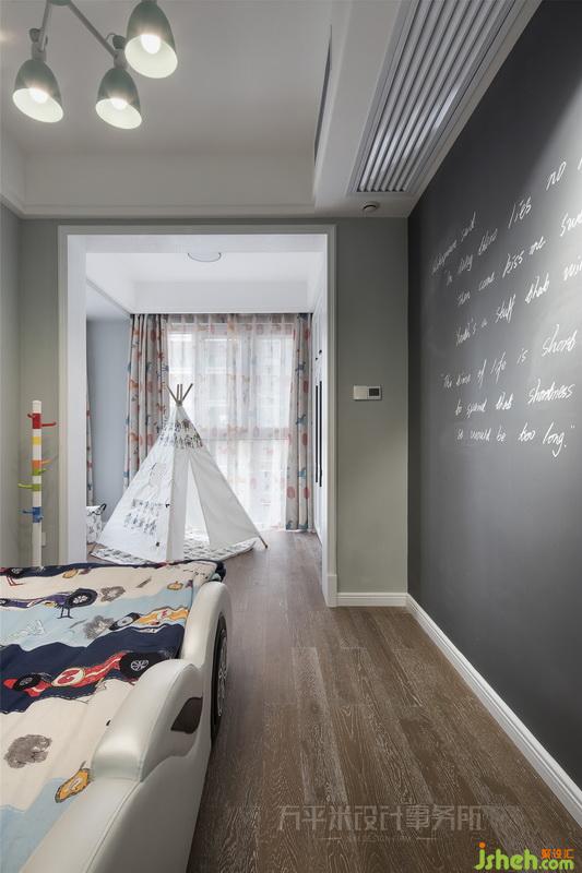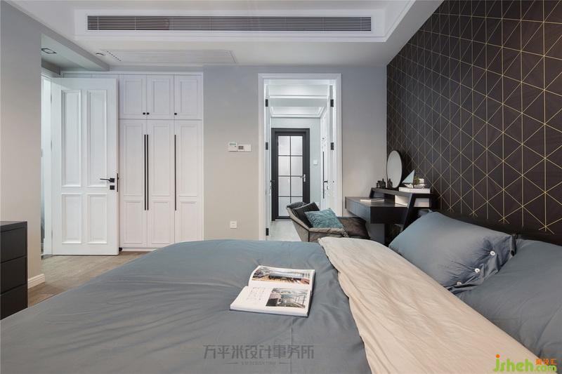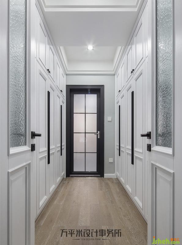 原有走廊過于狹長,因此將走廊的部分位置右移,用端景拉近視線。而主臥套間內曲折的原有過道部分也一分為二:靠近主臥一側成為內嵌式衣柜,朝向次臥一側則設置為開放式衣帽間,并納入原有的公共走廊部分,令兩個臥室得以修正,成為方正好用的房型。室內設計師