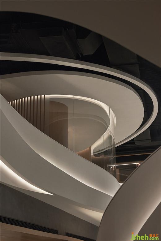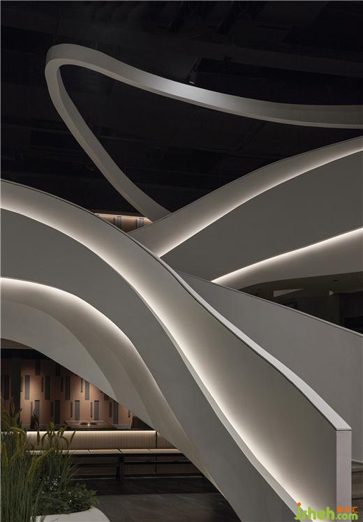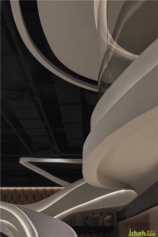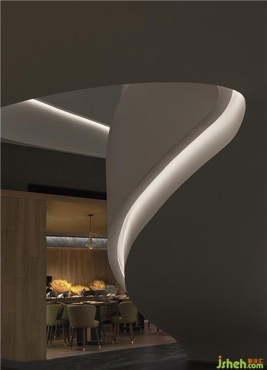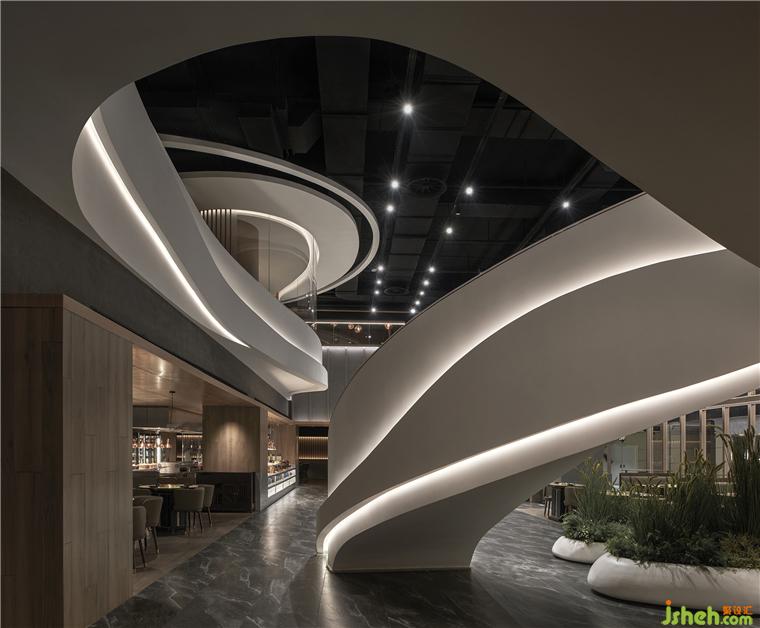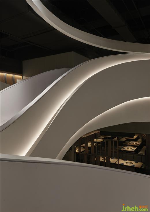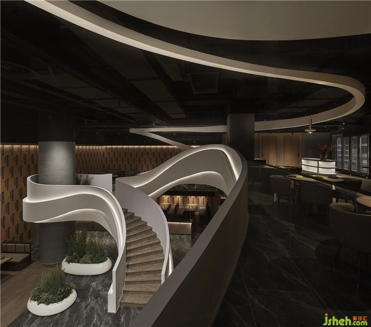 規(guī)整的空間內(nèi),一道扶搖而上的白色樓梯成為空間中的視覺(jué)重點(diǎn),自由流暢的曲線好似連綿的山脈。自助烤肉PLUS設(shè)計(jì)軟化了空間單一的直線構(gòu)成的同時(shí)也呼應(yīng)了品牌理念。
