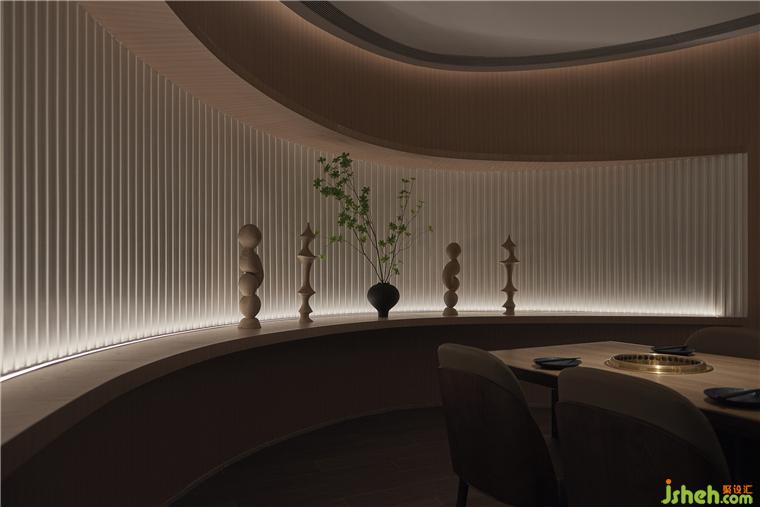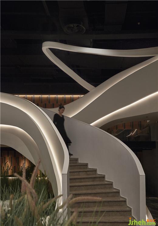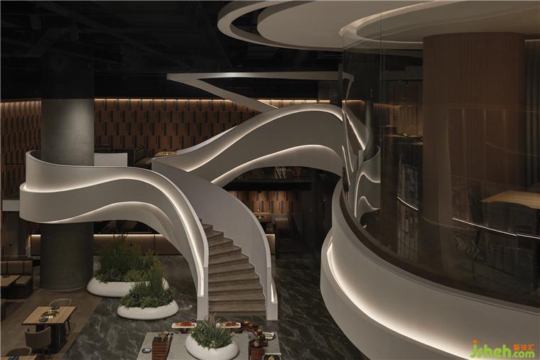 整體區(qū)域一層在開闊中錯落有致地排布餐位,善用光影,為不同的功能區(qū)塊特別設置了不同的光影氛圍,自助烤肉PLUS設計將空間利用率和就餐體驗達至平衡。串聯(lián)空間一層和二層的樓梯嵌入背光燈柔化空間的硬朗感,整體線條寫意勾勒,剛與柔、明與暗、方正與流線并舉,也讓大氣的餐飲空間定格了一抹靈動生機。