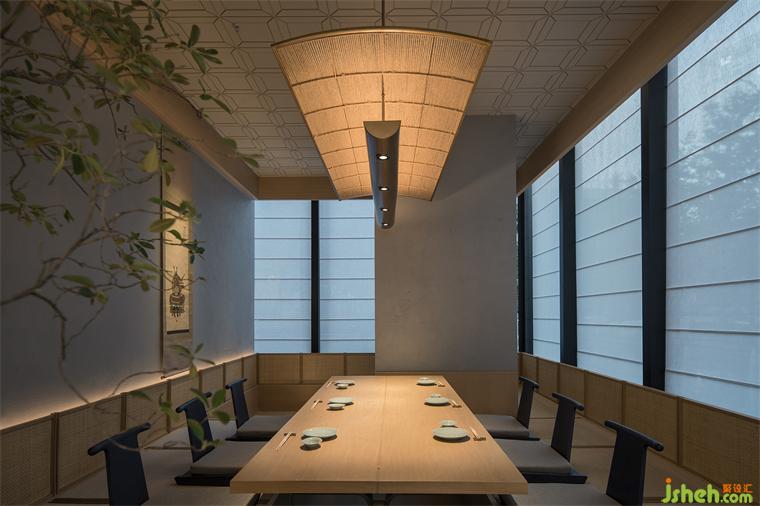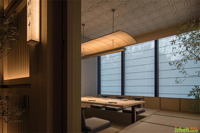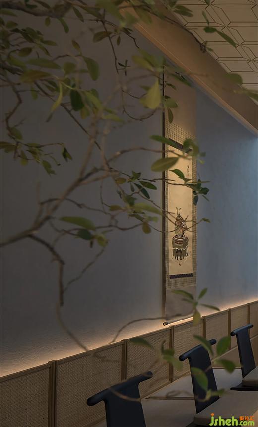 在空間裝飾上,餐廳設(shè)計師沒有直接對日式傳統(tǒng)民居建筑語言進(jìn)行的1:1轉(zhuǎn)述復(fù)刻,而是嘗試化繁為簡,以更為現(xiàn)代的設(shè)計語言傳遞傳統(tǒng)日式美學(xué)精神。陣列式的門頭和內(nèi)部垂直向的木格柵都是如此。