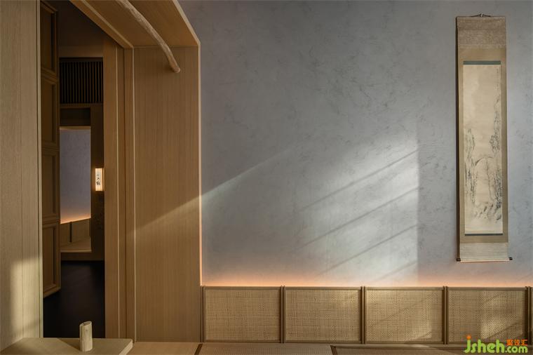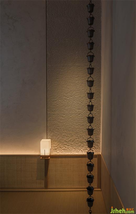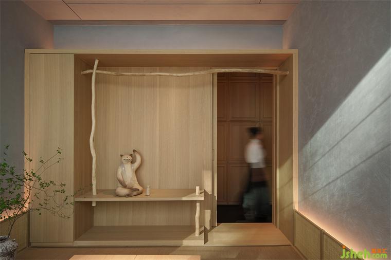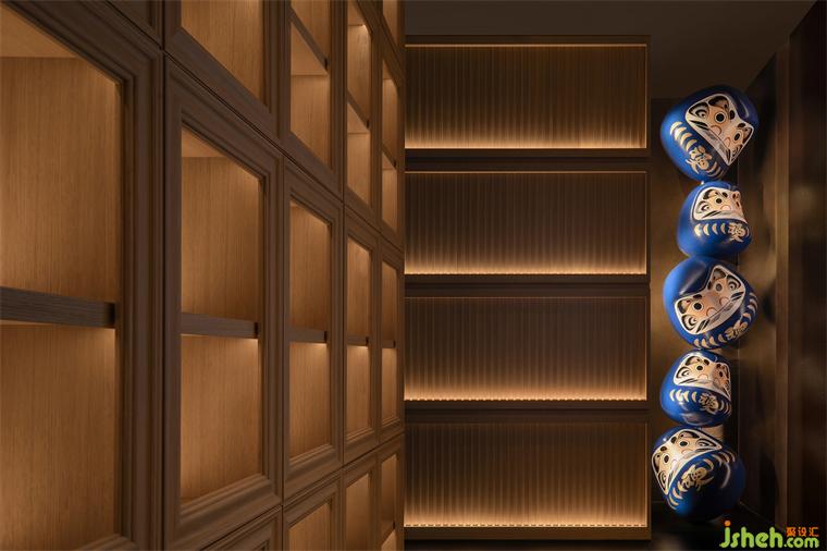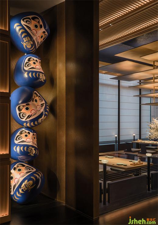 點綴在空間中的雕塑是設(shè)計師克制之外流露閃爍的意趣的體現(xiàn)——五只疊放的達(dá)摩不倒翁成為走道盡頭的端景,達(dá)摩作為日本最為受歡迎的吉祥物形象,憨態(tài)可掬,如同酒醉后顛倒的不規(guī)整形態(tài),打破了走道平淡與嚴(yán)肅的框架,如同吹拂而過的清風(fēng)為空間帶來了一絲放松。
