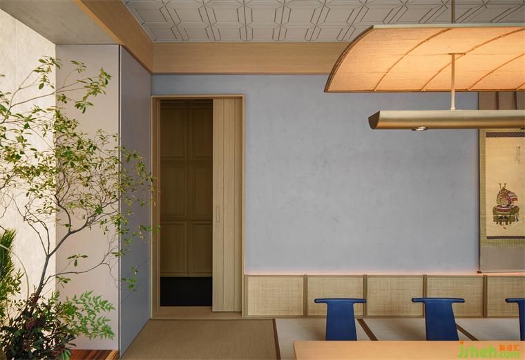 空間中還有很多與“紙”相關(guān)的元素讓立面有了生機(jī)和呼吸感。大廳中設(shè)計(jì)師基于對(duì)傳統(tǒng)和風(fēng)紋飾的吸收而原創(chuàng)的壁紙也恰到好處的為整體氛圍鋪陳。包廂中透光的杜邦紙搭配前方的植物,更有如山本梅逸的純墨色卷軸畫(huà)一般的風(fēng)骨。一窗之隔的室外是車水馬龍,室內(nèi)幽篁疏影,在方寸之間就能有了自然轉(zhuǎn)換的遠(yuǎn)近空間與細(xì)膩有致的層次布局。