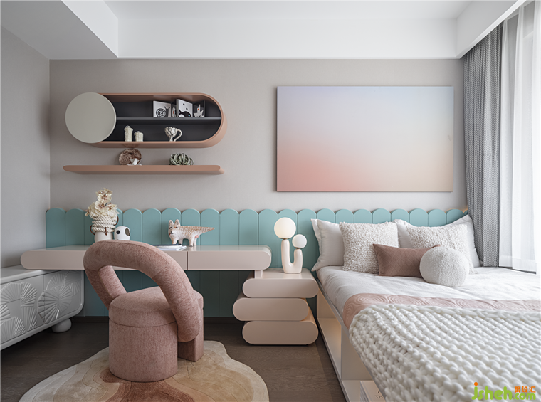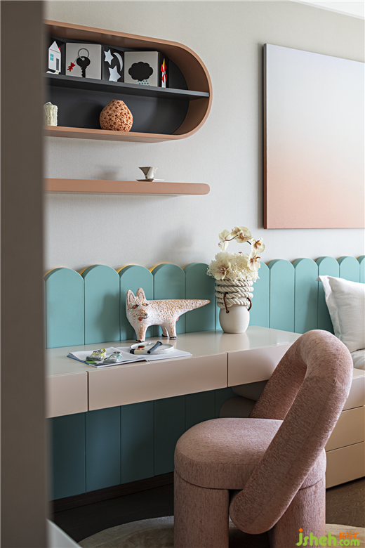 看似隨性奔放的藝術(shù)線條掛畫(huà)揭示出小朋友爛漫與天真的日常,非常規(guī)線條的家具陳設(shè),視覺(jué)上獨(dú)立又交織,增加了趣味元素,也豐富了空間的可能性。