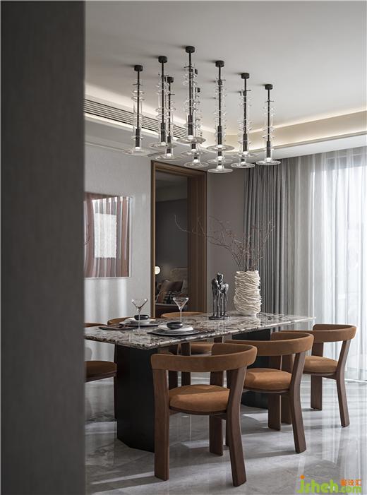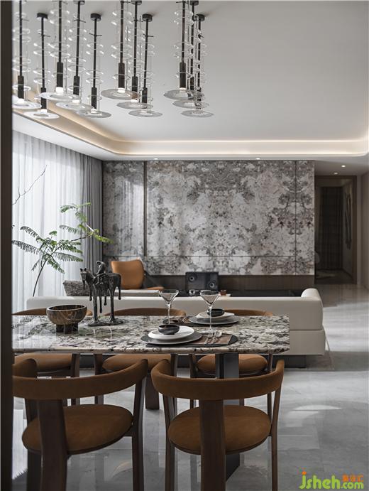 層疊規(guī)整的藝術(shù)吊燈透露著秩序感,將煙火氣與藝術(shù)性結(jié)合互融,為起居生活帶來了互動和趣味。