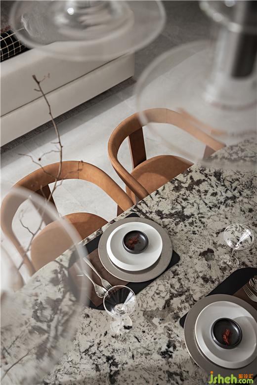 客餐廳圍而不隔,延續(xù)空間調(diào)性,橘色系的皮革座椅作為整個空間的色彩點綴,將鮮活靈動的語素融注于空間之中。