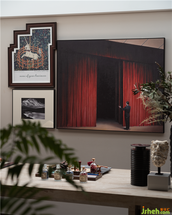 “藝術(shù)是一種享受,一切享受中最迷人的享受?!笨蛷d的藝術(shù)掛畫與玄關(guān)金屬裝飾遙相呼應(yīng),虛與實的碰撞帶來強烈的視覺沖擊力。