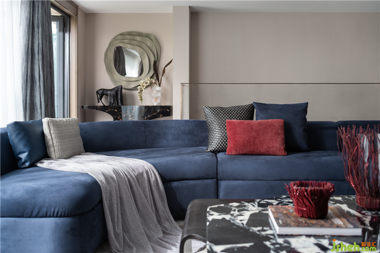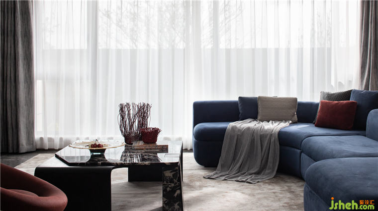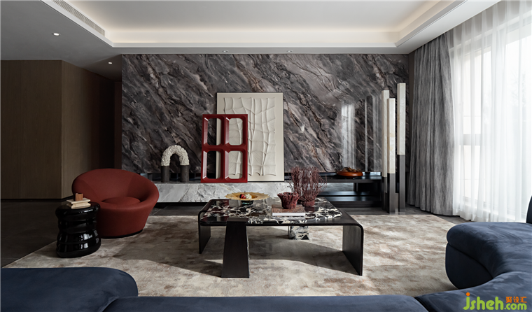 客廳半圍合式的主沙發(fā),圓弧線條營造出富有秩序的柔性美學(xué),與大理石相互碰撞,中和了石材的堅硬清冷,凝結(jié)成無可取代的精致奢華。