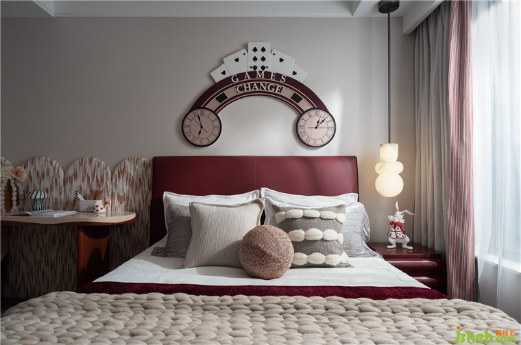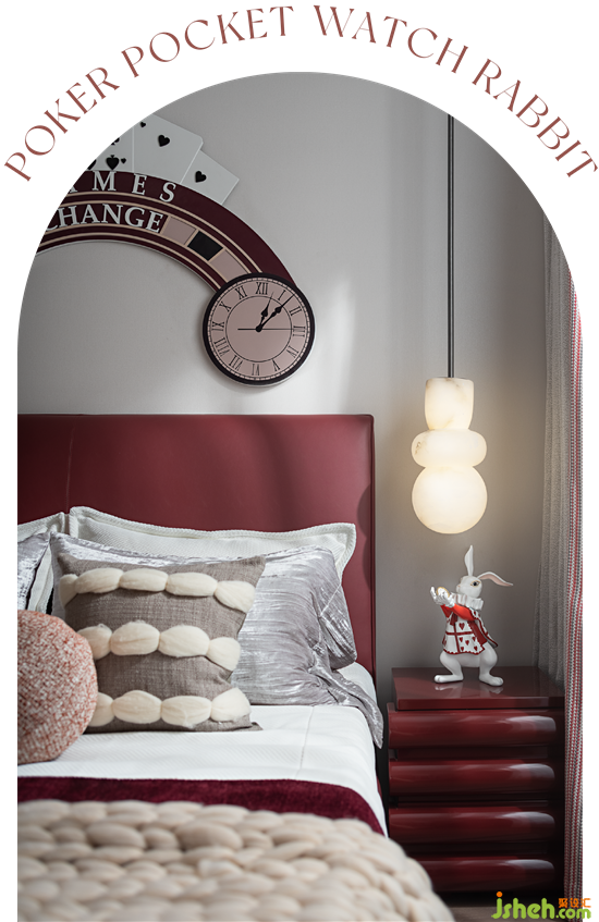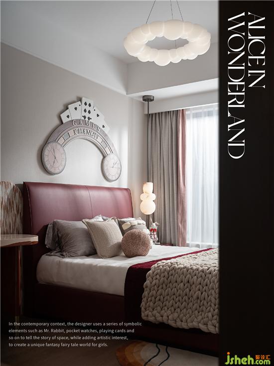 女孩房以愛麗絲夢游仙境為主題,成都樣板房設(shè)計(jì)師采用兔子先生、懷表、撲克牌等一系列符號化元素,將空間故事娓娓道來,在增添藝術(shù)性趣味的同時,打造一個獨(dú)屬于女孩的奇幻童話世界。