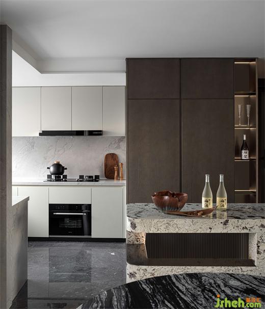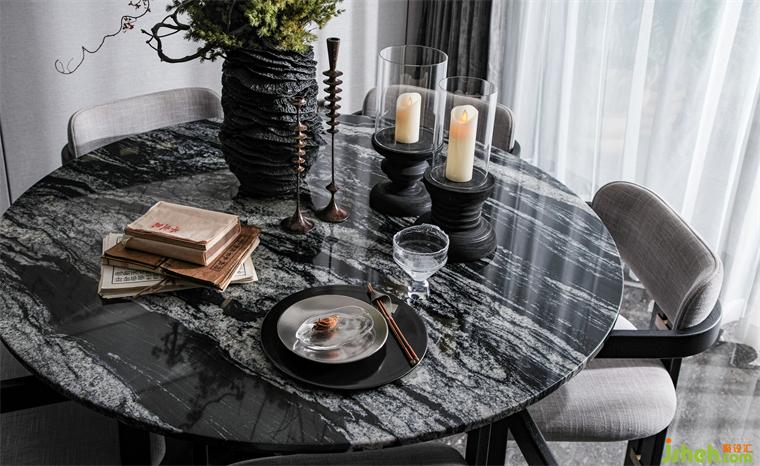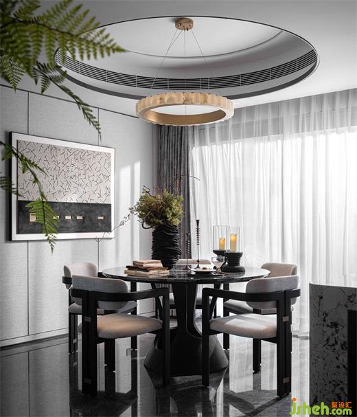 餐廳,一個(gè)可以回味的互動(dòng)空間。廚房與餐廳保持了最大限度的交融與連續(xù),樣板房設(shè)計(jì)以「圓」?fàn)?wèi)主基調(diào),圓桌有凝聚之意,與藝術(shù)圓環(huán)吊燈、弧形天花交相呼應(yīng),錯(cuò)落有致,輕盈高闊,寄托人和美滿的美好期盼。