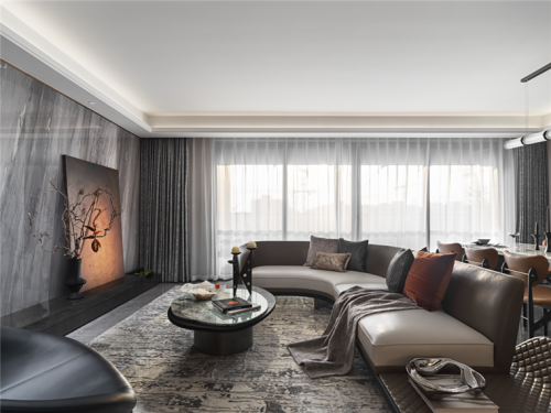 開門見山,萬壑有聲。舒展自然的客廳布局,串聯(lián)起節(jié)奏分明的起居動線,使公共區(qū)域間和諧呼應(yīng)。超大面積的落地窗模糊了內(nèi)外邊界,引入自然光源與意境,使人與自然真正融為一體,空間蘊含生命力的同時,也彰顯了無拘無束的生活態(tài)度。