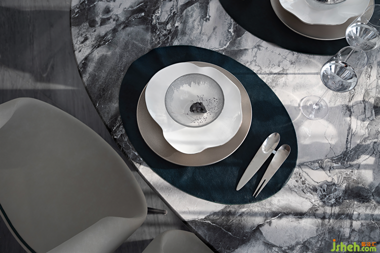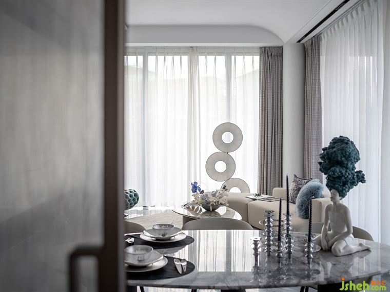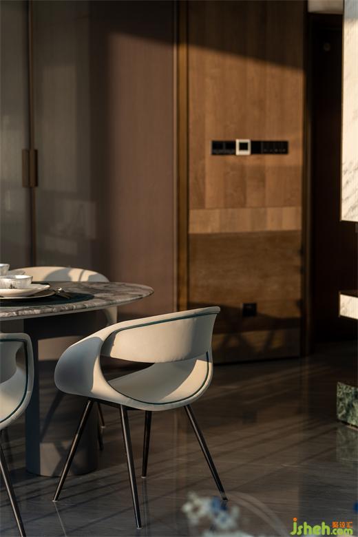 餐廳區(qū)域的設(shè)計描繪了日常生活的情感化與儀式感,曲線與直線的結(jié)合運用,呈現(xiàn)出回轉(zhuǎn)靈動的餐廳空間。在晨起暮落、柴米油鹽的熏染中,感受人間煙火的交織……
