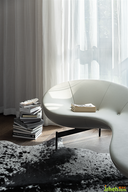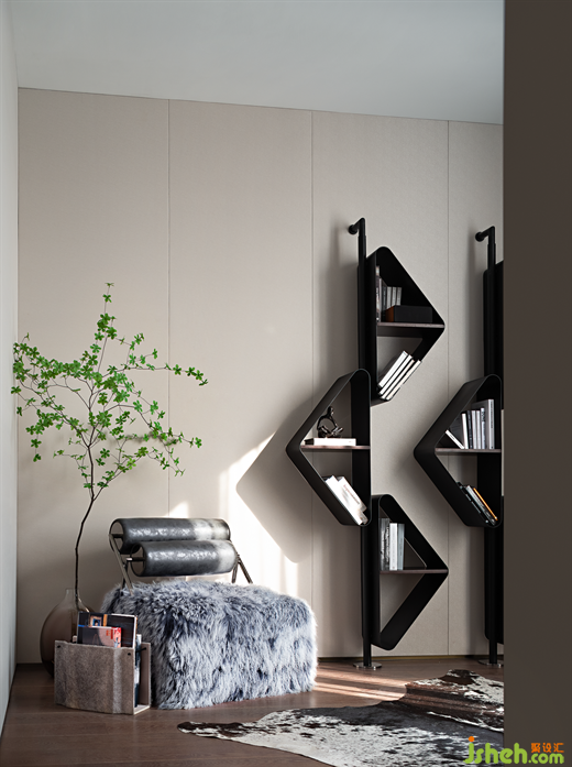 影音室,一處放松身心的精神角落。除去冗雜的裝飾,純樸簡約的主色調(diào),弧形沙發(fā)和異形書本陳列架,在生活的張弛間從容有度。